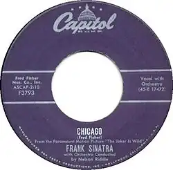 "Chicago" is a popular song written by Fred Fisher and published in 1922 by Fred Fisher. The original sheet music variously spelled the title "Todd'ling" or "Toddling." The song has been recorded by many artists, but the best-known versions are by Frank Sinatra, Ben Selvin and Judy Garland. The song alludes to the city's colorful past, feigning "... the surprise of my life / I saw a man dancing with his own wife",[1] mentioning evangelist Billy Sunday as having not been able to "shut down" the city, and State Street where "they do things they don't do on Broadway".