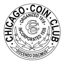 The club began as six men in 1903 who met for dinner in the Union League Club of Chicago who wanted to form a local numismatic group. From 1904-1918 the group would be known as the Chicago Numismatic Society. The first official meeting was called to order on February 14, 1919, with fifteen people in attendance. By 1930, the site of the club was the Sherman House Hotel but was moved to the Atlantic Hotel only a few months later. On January 19, 1938, the Chicago Coin Club was incorporated as a non-profit organization. That same year the club's seal was created which lists the Latin motto "DOCENDO DISCIMUS" (We Learn By Teaching).[1]