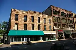 The Chick House's design is simple and utilitarian, reflecting its construction for use as a hotel. The three-story brick structure's 66 foot (20.1 m) east facade faces Main Street and its 149-foot (45.4 m) south facade faces toward Elm Street. The building incorporates elements from Greek Revival and Italianate styles and presents itself as an architectural "antithesis" to the adjacent Richardson Romanesque Stewart Building.[3] The Chick House originally has an "L" shape but additions during the 1890s, 1900s and in 1932 partially filled in the rear of the building, which faces toward an alley.[3]