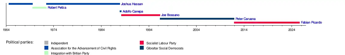 The chief minister of Gibraltar is the head of His Majesty's Government of Gibraltar who is elected by the Gibraltar Parliament, and formally appointed by the governor of Gibraltar, representative of the British monarch. The incumbent chief minister is Fabian Picardo, since 9 December 2011, leader of the Gibraltar Socialist Labour Party.
