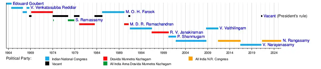Since 1963, Puducherry has had 10 chief ministers. The longest-serving and current chief minister, N. Rangasamy from the All India N.R. Congress, held the office for over sixteen years in multiple tenures. The former governor of Kerala M. O. H. Farook has the second-longest tenure, and V. Vaithilingam from the Indian National Congress has the third-longest tenure.[2] The inaugural holder Edouard Goubert from the Indian National Congress has the shortest tenure (only 1 year, 71 days).[3] There have been seven instances of president's rule in Puducherry, most recently in 2021.
