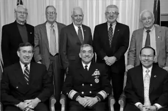 Several former chiefs of naval research photographed in 2005. Back: L. S. Kollmorgen, Brad Mooney, Dick Van Orden, Albert Baciocco, R. K. Geiger. Front: Paul Gaffney, Jay Cohen, William Miller.
