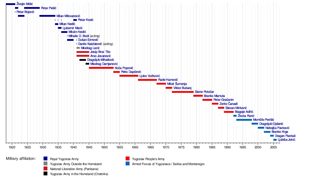 | 1 | Colonel general Života Panić (1933–2003) [j] | 20 May 1992 | 26 August 1993 | 1 year, 98 days | ||