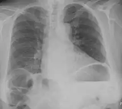 | Chest X-ray showing obvious Chilaiditi's sign, or presence of gas in the right colic angle between the liver and right hemidiaphragm. | |