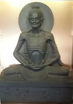 Some of the important original sculptures of different periods in history replicated and displayed in the museum are of: Arjuna's Penance (sculpture of the 7th century) at Mahabalipuram a part of the UNESCO World Heritage Site of the Group of Monuments at Mahabalipuram; Ugra Narasimha at Hampi of the Vijayanagara era temples; Gomteshwara (Jain Tirthankara) of 983 AD by the Ganga dynasty; Jesus Christ on the Cross of sixteenth century from Goa; Gudimallam Shivalinga from the first century BC from Chittoor in Andhra Pradesh; "Ravana Shaking Kailash" from the 5th century Dashavatara caves from Ellora; Trimurti from the Elephanta Caves of the Chalukyan rock-cut architecture; Rudra Shiva seventh century AD from Tala, in Chhattisgarh; Gyaraspur Yakshi from Madhya Pradesh of the Mauryan period;[1] Shalabhanjika from the Pratihara period of 9–10th century from Madhya Pradesh, which is a voluptuous image of a woman without hands sculpted from buff sandstone in the posture of dvibhanga, known as "Indian Monalisa";[2] a Gandhara art form of fasting Buddha in a skeletal form from the Kushan period of 3rd Century AD (the original sculpture is in Lahore Museum in Pakistan);[2][4] Preaching Buddha of thirteenth century from Sarnath of the Gandhara School of Art, Didarganj Yakshini from Bihar which unearthed in 1917 from the bank of Ganga River in 1917 and presently exhibited at Patna Museum, a drunken woman from Mathura. These sculptures represent many schools of art and architecture that existed in the past.[1][2][4][5] The sculptures on display are made from fibreglass. There is also a gallery where photographs of the original monuments, before and after renovations done by ASI, are displayed.[2] The artists who created the replicas have made improvements on the original sculptures such as in the case of Deedarganj Yakshni in the Patna Museum. The original sculpture had its nose and a hand damaged which was rectified in the replica. In the same manner, a replica of the Ashoka pillar at Sarnath is now made with the "wheel with four lions seated back to back", while the original does not have this feature.[4]