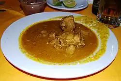 Chileajo de cerdo is a dish originating from Oaxaca, Mexico. It consists of pieces of pork boiled in water and cooked in a thick sauce made of toasted guajillo chili without seeds, toasted ancho chili without seeds, raw costeño amarillo chili without seeds, roasted and peeled garlic, cloves, oregano, cumin, red and green tomatoes, salt and pepper. This dish may be served with bayo beans.