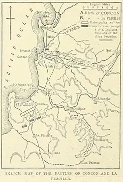 In the middle of August 1891 the rebel forces were embarked at Iquique, numbering in all about 9,000 men, and sailed for the south. The expedition by sea was admirably managed, and on 10 August the Congressional army was disembarked at Quintero, about 20 km. north of Valparaiso and not many miles out of range of its batteries, and marched to Concón, where the Balmacedists were entrenched.