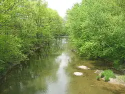 The upper reaches of the watershed of Chillisquaque Creek are in the Muncy Hills.[11] Montour Ridge is located to the south of the watershed.[12] Additionally, Limestone Ridge is situated near the creek.[13] The creek's drainage basin mainly consists of rolling agricultural land, with some forested floodplains.[8][12] Much of the central part of Montour County is in the 100-year floodplain of the creek and its tributaries.[14] In places, it has high, muddy banks, and is generally "placid", save for some riffles and gravel bars. It is rarely blocked by fences and fallen trees, but there are a few strainers.[8] A seep is located along the creek near the Bucknell preserve and a spring is located below Pennsylvania Route 54.[8][15]