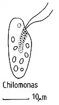 Chilomonas is a genus of cryptophytes, including the species Chilomonas paramecium.[2] Chilomonas is a protozoan (heterotroph). Chilomonas is golden brown and has two flagella.