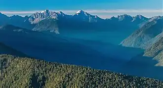 Chimney Peak is a 6,917-foot-elevation (2,108-meter) mountain summit located within Olympic National Park in Jefferson County of Washington state. Chimney Peak is situated near the head of Elwha Valley, and immediately north above Enchanted Valley. Topographic relief is significant as the southeast aspect rises 4,800 feet (1,500 meters) above Enchanted Valley in less than one mile. Enchanted Valley is also known as Valley of 10,000 Waterfalls, and numerous waterfalls tumble down the immense cliffs of Chimney Peak.[4][5] Neighbors include Crystal Peak, 2.2 mi (3.5 km) to the north, White Mountain 3.5 mi (5.6 km) to the east, and West Peak 3.4 mi (5.5 km) to the northeast. Precipitation runoff from the mountain drains north to the Elwha River, and south to the Quinault River.