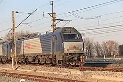 The HXD2C is a 6 axle Co′Co′ freight locomotive which shares a similar exterior design with the HXD2B. The individually inverter controlled traction motors, body structure overall structural design also are the same as other members of the series;[1] with transformers from ABB.[2] The locomotive power is reduced to 7.2 MW (9,700 hp), suitable for trains of 5,000–6,000 tonnes (4,900–5,900 long tons; 5,500–6,600 short tons). The locomotive can be ballasted to give axle loads from 23 to 25 tonnes (22.6 to 24.6 long tons; 25.4 to 27.6 short tons).[1] The HXD2C locomotives are constructed by CNR Datong.[3]