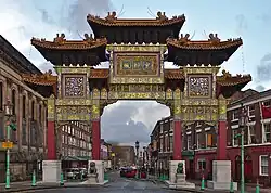 The Chinatown area of Liverpool, England, is home to the oldest Chinese community in Europe.[1] Based in Great George ward in the south of the city centre, Chinatown has many Chinese businesses, restaurants and supermarkets, and facilities for the Chinese community. The area is also notable for its Chinese-style architecture; with the paifang on Nelson Street being the largest, multiple-span arch of its kind outside China.[2]
