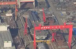 Construction began in the mid-2010s. The National Interest reported it began March 2015.[15] The Diplomat reported that "initial work" began in February 2016, with Shanghai Jiangnan Shipyard Group receiving a notice to proceed in March 2017.[16] Work was reportedly delayed in June 2017 by EM and steam catapult tests.[17] By November 2017, work had resumed after the PLAN reportedly developing an IEP system to power the EM catapults.[18][19][20] The first prefabricated block modules were placed into the dry dock in July 2020, and most of the keel and base hull blocks were in place by early September 2020. The superstructure was installed by July 2021.[21]