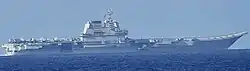 Shandong (17; Chinese: 山东舰; pinyin: Shāndōng Jiàn) is a Chinese aircraft carrier that was launched on 26 April 2017 for the People's Liberation Army Navy (PLAN) of the People's Republic of China.[6] She is the country's first domestically built aircraft carrier and second in PLAN service after the completion and commissioning of Liaoning, from which she is derived. Shandong's class was initially suspected to be designated Type 001A[7] (as Liaoning received the designation Type 001) but was revealed to be Type 002 at her commissioning ceremony.[8] The class received the NATO reporting name Kuznetsov Mod. ("modified"), since the design of the ship is a modified version of and similar to the Kuznetsov-class aircraft carrier originally made for the Soviet Navy.[9][10]