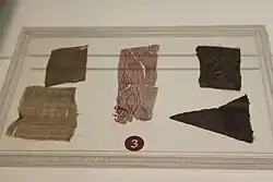 Silk funerary money (絲織品做的冥幣; 丝织品做的冥币; sī zhī pǐn zuò de míng bì) has been uncovered in tombs and other burial sites dating to the Han dynasty period. Silk fabric was considered to be a valuable form of commodity in China during ancient and imperial times and bolts of silk could also be used as a type of currency because of its high market value.[5] The Silk funerary money that was recovered from Tomb No. 1 (the tomb of Xin Zhui) at the Mawangdui archaeological site. The silk funerary money that was recovered from the Mawangdui site was moved to be on display at the Hunan Provincial Museum, as of March 2015.[5]