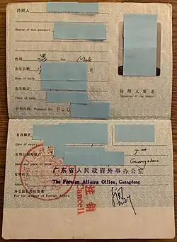 A different passport for public affairs (Chinese: 因公普通护照; lit. 'ordinary passport for public affairs') was issued until 2006. Unlike the current version, it was classified as a variation of ordinary passport. The abuse of the use of document resulted in its subsequent cancellation. Unlike other passports, it was issued by the provincial or municipal Foreign Affairs Offices, rather than the Ministry of Foreign Affairs or the Ministry of Public Security.[16] Chinese ordinary passport for public affairs was used at the end of the 1980s and the 1990s. The passport information was written by hand, and these ordinary passports were usually valid for 2 or 5 years.