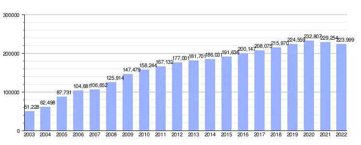 Vertical bar chart of foreign population of Chinese nationality in Spain between 2003 and 2022