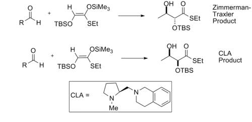 In the aldol reaction, the diastereoselectivity of the product is often dictated by the geometry of the enolate. The Zimmerman–Traxler model predicts that the Z enolate will give syn products, and that E enolates will give anti products. Reactions catalyzed by tin-based CLAs allow products to deviate from this pattern.[9]