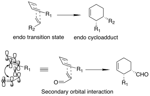 Diels–Alder reactions can lead to the formation of a variety of structural isomers and stereoisomers. Molecular orbital theory considers that the endo transition state, instead of the exo transition state, is favored (endo addition rule). Also, augmented secondary orbital interactions have been postulated as the source of enhanced endo diastereoselection.