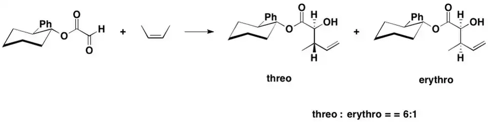 One type of chiral auxiliary is based on the trans-2-phenylcyclohexanol motif as introduced by James K. Whitesell and coworkers in 1985. This chiral auxiliary was used in ene reactions of the derived ester of glyoxylic acid.[16]