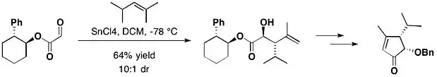 In the total synthesis of (−)-heptemerone B and (−)-guanacastepene E, attached with trans-2-phenylcyclohexanol, the glyoxylate reacted with 2,4-dimethyl-pent-2-ene, in the presence of tin(IV) chloride, yielding the desired anti adduct as the major product, together with a small amount of its syn isomer with 10:1 diastereomeric ratio.[17]