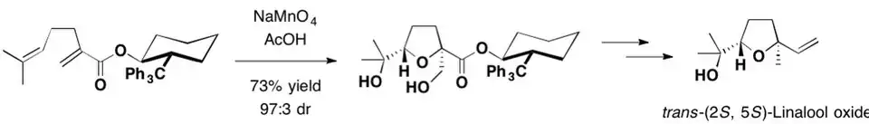 - ^ Al Hazmi, Ali M.; Sheikh, Nadeem S.; Bataille, Carole J. R.; Al-Hadedi, Azzam A. M.; Watkin, Sam V.; Luker, Tim J.; Camp, Nicholas P.; Brown, Richard C. D. (2014). "trans-2-Tritylcyclohexanol as a Chiral Auxiliary in Permanganate-Mediated Oxidative Cyclization of 2-Methylenehept-5-enoates: Application to the Synthesis of trans-(+)-Linalool Oxide". Organic Letters. 16 (19): 5104–5107. doi:10.1021/ol502454r. PMID 25225741.