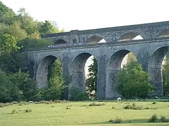The aqueduct was designed by civil engineer Thomas Telford[1] for the Ellesmere Canal. The resident engineer was M. Davidson who also acted as resident engineer on a number of Telford's other works.[1] The foundation stone was laid on 17 June 1796 and it was completed in 1801.[2] It has a cast iron trough within which the water is contained. The masonry walls hide the cast iron interior. The aqueduct followed Telford's innovative Longdon-on-Tern Aqueduct on the Shrewsbury Canal, and was a forerunner of the Pontcysyllte Aqueduct, also on the Llangollen Canal.[3] The aqueduct was briefly the tallest navigable one ever built, and it now is Grade II* listed in both England and Wales.[4][5] It forms part of the Pontcysyllte Aqueduct World Heritage Site.[5]