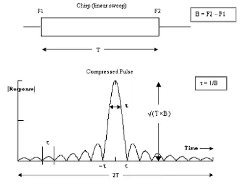 Briefly, the basic pulse compression properties can be related as follows. For a chirp waveform that sweeps over a frequency range F1 to F2 in a time period T, the nominal bandwidth of the pulse is B, where B = F2 – F1, and the pulse has a time-bandwidth product of T×B. Following pulse compression, a narrow pulse of duration τ is obtained, where τ ≈ 1/B, together with a peak voltage amplification of T×B.