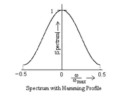 Although these cosine functions are amenable to mathematical manipulation, they are rarely chosen to define the spectral characteristics of a chirp, in practice, because when compressed they give broad main pulses with high side-lobe levels. A better characteristic (among many)[11] is the Hamming function, given by