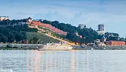 The Chkalov Stairs (Russian: Чкаловская лестница) is a monumental flight of steps in the center of Nizhny Novgorod, connecting Minin and Pozharsky Square, the Upper Volga and the Lower Volga embankments. It was built by the architects Alexander Yakovlev, Lev Rudnev and Vladimir Munts.[1] It is the longest staircase in Russia.[2][3] The staircase starts from the monument to Chkalov, near the St. George's Tower of the Kremlin. It is built in the form of a figure of eight and consists of 560 steps, if you count it both sides.[4] The number of steps from the bottom to the top is 442 on the right. In the intersections of the side slopes there are two observation platforms. At the bottom of the stairs is a monument to the boat "Hero", which is located at the Lower-Volga embankment.