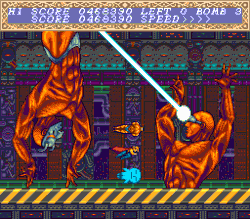 The player can pick up one of three support options by collecting randomly appearing power-ups. The most common is Samson/Adon, musclebound men clad in Speedos. The two hover about the hero, firing shots from the holes in their bald heads. The pair eventually became the series' mascots. The other options are Angel and Uminin.