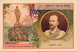 Victor-Auguste Poulain began the mass production of chocolate in 1848 in Blois, France,[2][1] before forming a limited company in 1893. He believed that a commercial future in chocolate would be found by selling to the masses and was innovative in industrialising the production of chocolate and in widespread marketing campaigns targeting children and families. In 1975, Chocolat Poulain was the sponsor of the mountains classification in the Tour de France when its distinctive polka jersey was introduced; the jersey's design was based on the jersey of the pre-War cyclist Henri Lemoine and later, due to its popularity, the design was adopted for wrapping of their chocolate bars.[3][4]