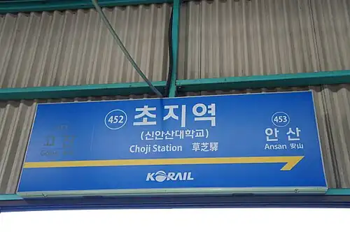 Choji station (Korean: 초지역) is a commuter railway station on Seoul Subway Line 4, the Suin–Bundang Line and the Seohae Line in Ansan, South Korea. Trains on Line 4 utilize what is officially named the Ansan Line within the city of Ansan, as do those on the Suin-Bundang Line, which stop at the station on the same tracks using the same platforms.[1]
