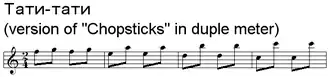 An equivalent of this rudimentary two-finger piano exercise was known in Russia in duple meter as "tati-tati" or the "Cutlet Polka". This version alternates the notes between the hands, rather than playing them at the same time in harmony.