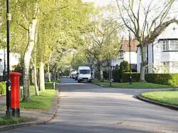 The Chorltonville estate comprises 262 houses in twelve roads, centred on a "village green", The Meade. It measures about 550 yards east-west by 280 yards north-south—around 26 acres. The estate is separated from the central part of Chorlton on the north by Chorlton Brook,[1] and on the south side borders the Hardy Lane residential area and the fields of Hardy Farm in the Mersey Valley Countryside area.[2] Vehicular access is via Claude Road (east) or Brookburn Road (north), and there is a footpath to Hurstville Road on the south side and another towards Hardy Farm to the south-west. The estate and an adjoining football field (owned and occupied by West Didsbury & Chorlton Football Club) are one of Manchester Council's 32 conservation areas. The designation was made in 1991.[3][4]