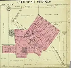 Chouteau Springs was officially platted in 1886 beside a mineral spring,[20] and named after Jean Pierre Chouteau, the original owner of the town site.[21]