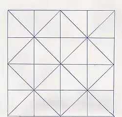 Similarly, according to Aryan (1983), the term chowk-poorana in Punjab refers to floor art and mud wall painting. This art is primarily practised by women and is a folk tradition.[4] In Punjab, during festivals such as Holi, Karva Chauth and Diwali, walls and courtyards of rural houses are enhanced with drawings and paintings similar to rangoli in South India, mandana in Rajasthan, and rural arts in other parts of India. Chowk-poorana mud wall art in Punjab is given shape by the peasant women of the state. In courtyards, this art is drawn using a piece cloth. The art includes drawing tree motifs, flowers, ferns, creepers, plants, peacocks, palanquins, geometric patterns along with vertical, horizontal and oblique lines. These arts add to the festive atmosphere.[5]