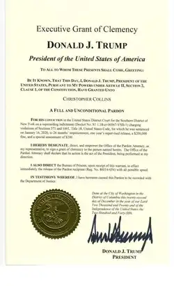 Collins and his son, Cameron Collins, were arrested by the Federal Bureau of Investigation on August 8, 2018 and charged with insider trading and making false statements. Three days later, Collins announced that he was suspending his bid for a fourth term in Congress; however, on September 17, 2018, he resumed his re-election campaign. Collins was narrowly re-elected to Congress on November 6, 2018. On September 30, 2019, Collins announced his resignation from the House of Representatives.[5] His resignation went into effect on October 1, and he pleaded guilty later that day.[1][3] Collins began serving a 26-month prison sentence in October 2020, but was pardoned by President Donald Trump on December 22, 2020.