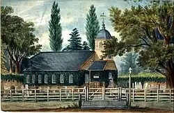 The Weld Chapel (right) in 1862 during the construction of Christ Church[9] -