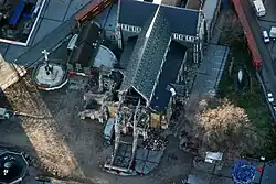 On 2 March 2012, Matthews announced that the building would be demolished.[72] She questioned the safety of the building and stated that rebuilding could cost NZ$50,000,000 more than insurance would cover and that a new cathedral would be built in its place.[73] The decision was supported by 70 local Christchurch churches and Christian groups.[74] In late March 2012, demolition began and the scope involved removing the windows and demolishing the tower.[75] By 23 April 2012, the stained glass of nine windows had been removed and work had begun to pull down masonry from the tower to give safe access to further stained glass windows.[76][77]