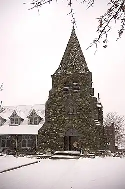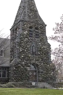 Christ Church was designed by Peabody and Stearns, masters of American Shingle style architecture,[8] and was constructed of native Waltham fieldstone in the English Country style.[9] The inspiration for the church's stone exterior came indirectly from architect H. H. Richardson, who was also a friend and Harvard classmate of Robert Treat Paine Jr. When Paine remodeled and expanded his Waltham home in 1883, it was Richardson who designed the residence that would become Stonehurst, a Shingle style mansion built of glacial stones quarried on site from Paine's estate.[6] Richardson died in 1886 and played no part in the planning of Christ Church, but it was his Stonehurst design that inspired Robert Treat Paine Jr. to use the same stones from his property for the exterior of the church.[7]