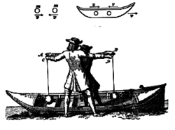 Huygens first re-derives Archimedes's solutions for the stability of the sphere and the paraboloid by a clever application of Torricelli's principle (i.e., that bodies in a system move only if their centre of gravity descends).[86] He then proves the general theorem that, for a floating body in equilibrium, the distance between its centre of gravity and its submerged portion is at a minimum.[8] Huygens uses this theorem to arrive at original solutions for the stability of floating cones, parallelepipeds, and cylinders, in some cases through a full cycle of rotation.[87] His approach was thus equivalent to the principle of virtual work. Huygens was also the first to recognize that, for these homogeneous solids, their specific weight and their aspect ratio are the essentials parameters of hydrostatic stability.[88][89]