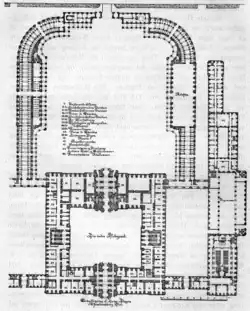 The palace complex, which was in Rococo style, consisted of a four-winged main building connected to various other buildings, including a court theatre and stables, arranged around large show grounds. There was also an attached chapel located at the site of the present-day Christiansborg Chapel. It was the largest palace in Europe for a short while, until the fire destroyed it.