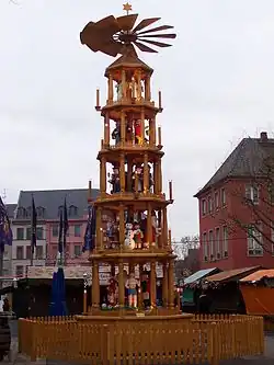 Christmas pyramids (German: Weihnachtspyramide) are Christmas decorations that have their roots in the folklore and customs of the Ore Mountain region of Germany, but which have become popular internationally. They comprise a decorated pyramidal outer frame with candle holders and a central carousel with a rotor at the top which is driven by warm air from the lit candles. The carousel is decorated with nativity scenes and other Christmas figures such as angels and wise men, as well as worldly motifs such as mining folk and forest scenes.