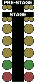 Vehicles have advanced to the pre-staging point 7 in (180 mm) behind the starting line, breaking the first set of light beams on the track and activating the Christmas tree starting lights. |