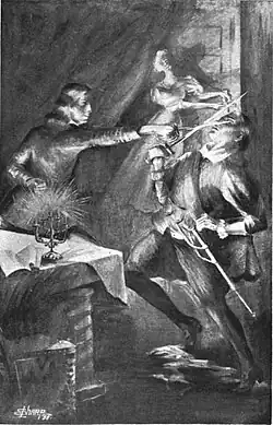 Marlowe first appeared as a literary figure in 1825 in the first part of Ludwig Tieck's novella Dichterleben. In it, Tieck addresses, among other things, the conflict between Romanticism, represented by Shakespeare, and Sturm und Drang, represented by Marlowe.[5] The opposite view was held by Richard Henry Horne, in whose 1837 drama The Death of Marlowe Marlowe first appeared as a fictional character in English literature. Horne's Marlowe is Romanticism personified.[6] Although numerous authors have since had Marlowe appear in a wide variety of literary genres, this has been done with astonishing unimaginativeness. He is usually the homosexual outsider who rebels against the establishment and fits perfectly into the Elizabethan theatre world, which is described as a gathering place for alternative lifestyles.[7]