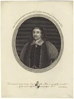 Sir Christopher Packe (c. 1593 – 27 May 1682) was an English merchant and politician who served as the Lord Mayor of London in 1654. Born in Northamptonshire, he subsequently moved to London and became a member of the Worshipful Company of Drapers and the Company of Merchant Adventurers of London. In 1655, Packe was knighted and appointed as an commissioner of the Admiralty. A strong ally of Oliver Cromwell, he proposed on 23 February 1656 in the Second Protectorate Parliament the Humble Petition and Advice, which unsuccessfully attempted to persuade Cromwell to crown himself. After the Stuart Restoration, Packe was barred from holding public office and died in 1682.[1]