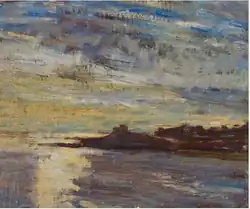 His early work has been described as 'photo realist' in style, while his later works of predominantly landscape subjects are in the modern impressionist or abstract style, showing the influence of previous British landscape painters who eschewed solid objects and detail in favour of expressing the spiritual elements of their subjects, such as J. M. W. Turner.[4]