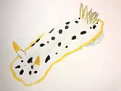 Chromodoris orientalis is a species of colourful sea slug, a dorid nudibranch, a marine gastropod mollusc in the family Chromodorididae.[1][2] Sea slugs are generally very beautifully colored organisms with intense patterns and ranging in sizes. The Chromodoris orientalis specifically is a white sea slug with black spots in no particular pattern with a yellow, orange, or brown in color ring around its whole body and on its gills. There is much discussion on where it is found, what it eats, how it defends itself without a shell, and its reproduction methods. This is all sought after information because there is not much known about these animals.