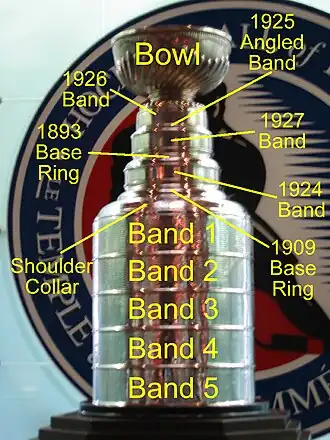 | 1926–27 | Ottawa Senators | "Won By / Ottawa Senators / 1926–27", plus 17 names added. | A new ring added between Victoria's 1925 ring and the 1893 base ring |